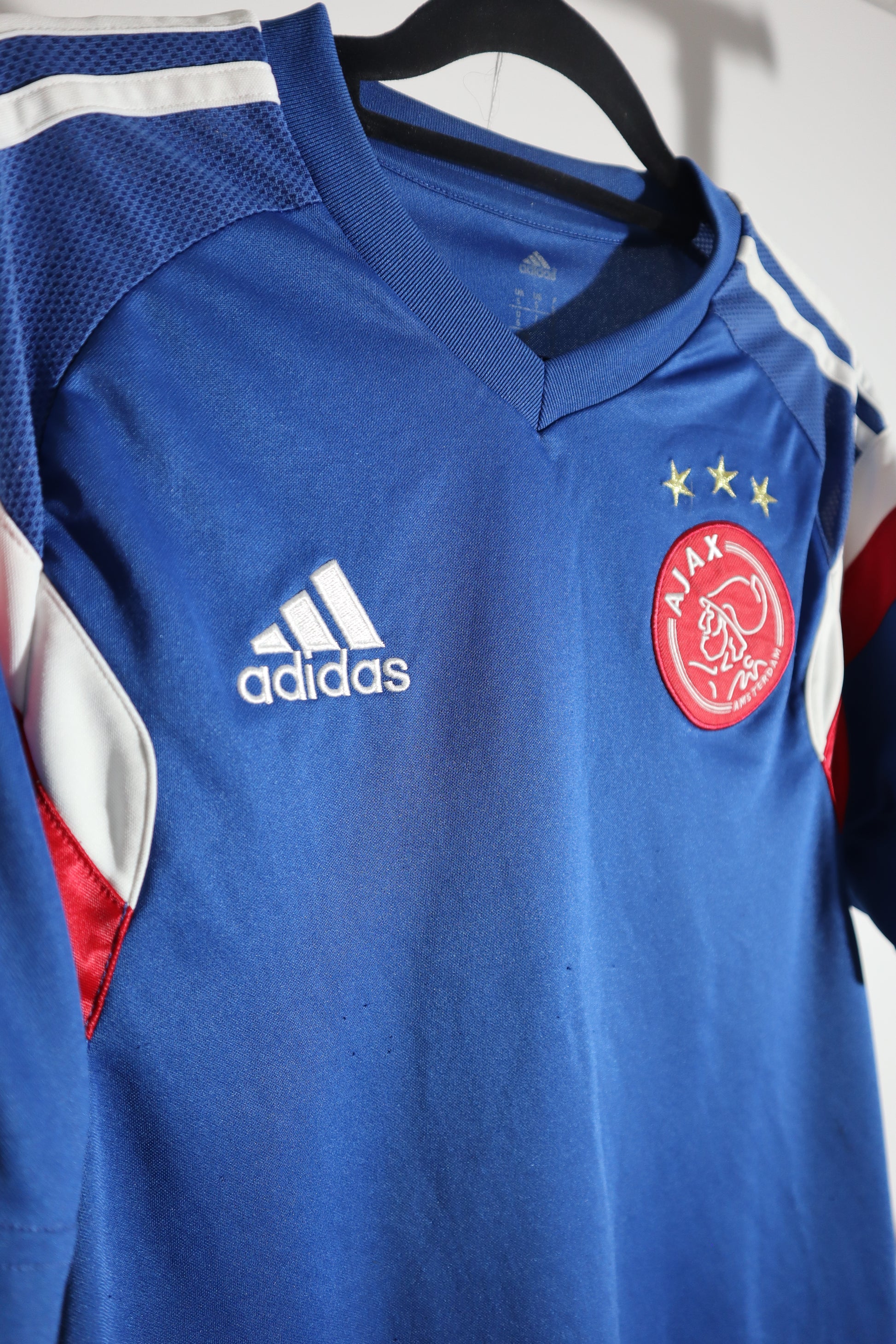 A royal blue Adidas training top with white and red geometric detailing on the sleeves, featuring the iconic Amsterdam club's crest. The classic colorway with retro diamond patterns represents Ajax's commitment to style even in training wear, likely from the era when they were developing their latest generation of world-class talent through their legendary academy.