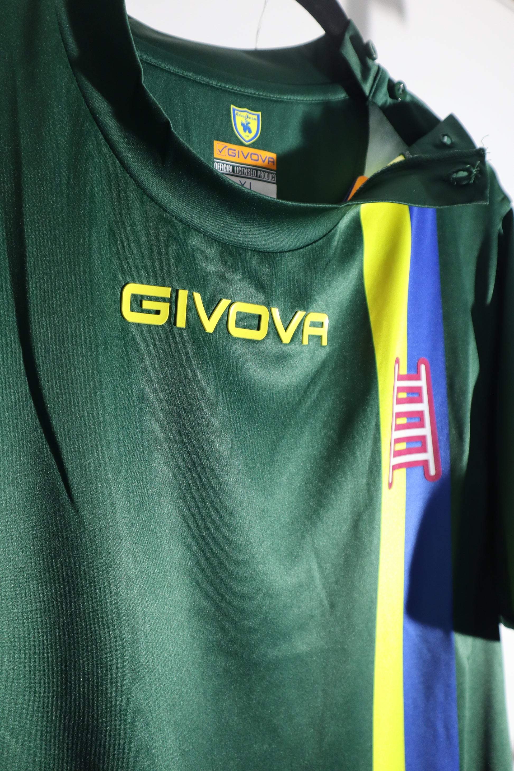 A deep green Givova shirt featuring an asymmetric yellow and blue stripe with ladder graphic and symbolic imagery down the right side. The artistic, almost avant-garde design with its colorful vertical band and unique graphics creates a wearable art piece representing the now-defunct Serie A club's creative approach to kit design before their controversial bankruptcy and dissolution.