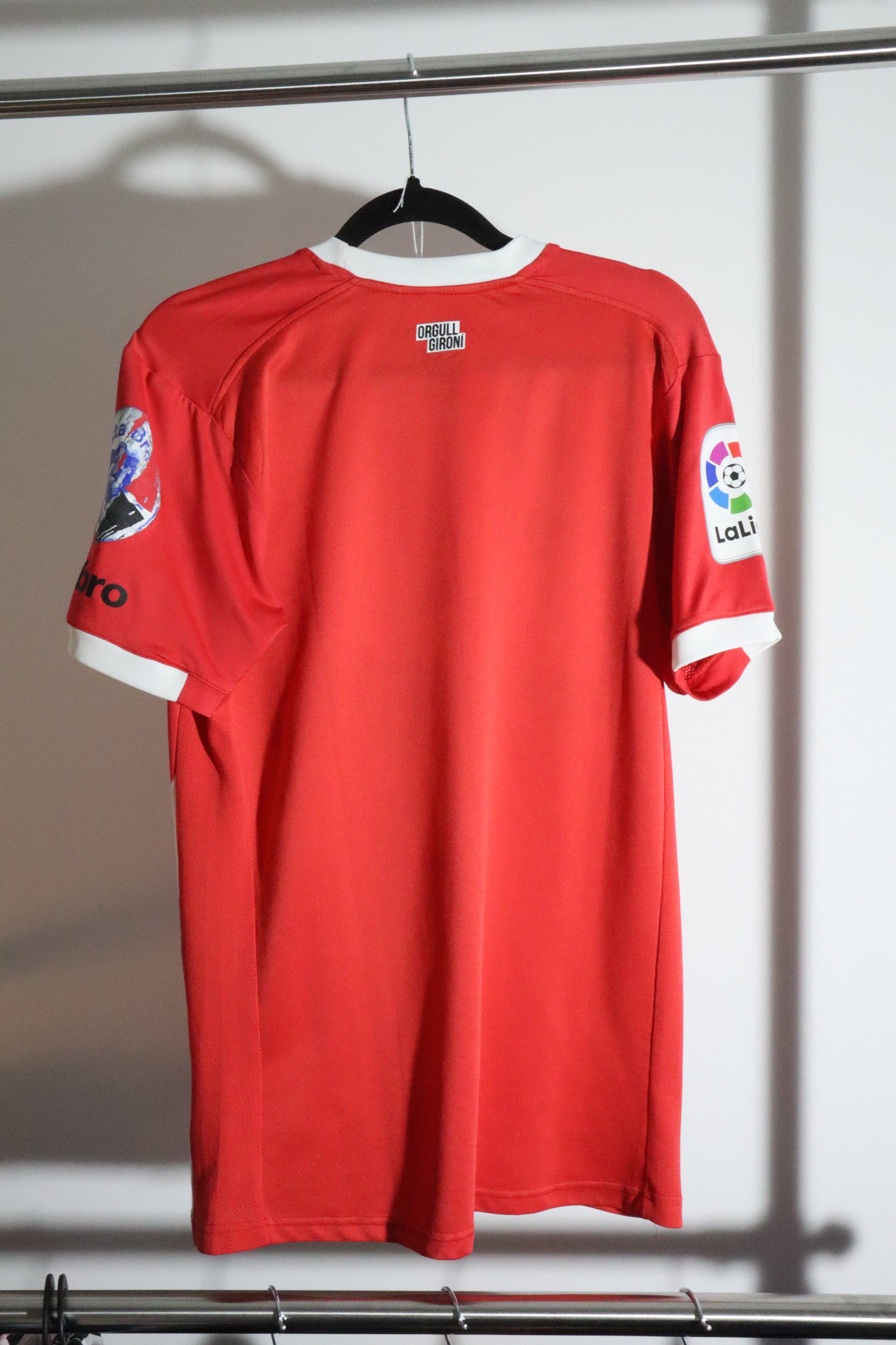 A classic red and white diagonal striped Umbro home shirt featuring Marathon Bet sponsorship and the club's coordinates embroidered inside the collar. The clean, traditional sash design honors Girona's remarkable recent rise from lower league obscurity to La Liga contenders, now competing in European competition under the City Football Group ownership.