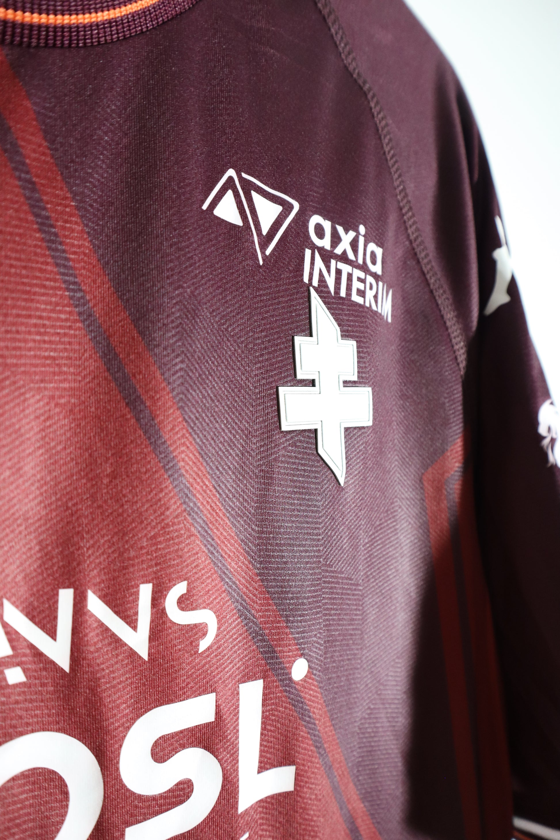 A burgundy home shirt from French Ligue 2 side FC Metz, featuring Kappa branding and multiple local sponsors including "Car Avenue" and references to the Moselle region. The rich maroon color with geometric patterns reflects the club's eastern French identity and their ongoing battle to return to Ligue 1 after relegation.