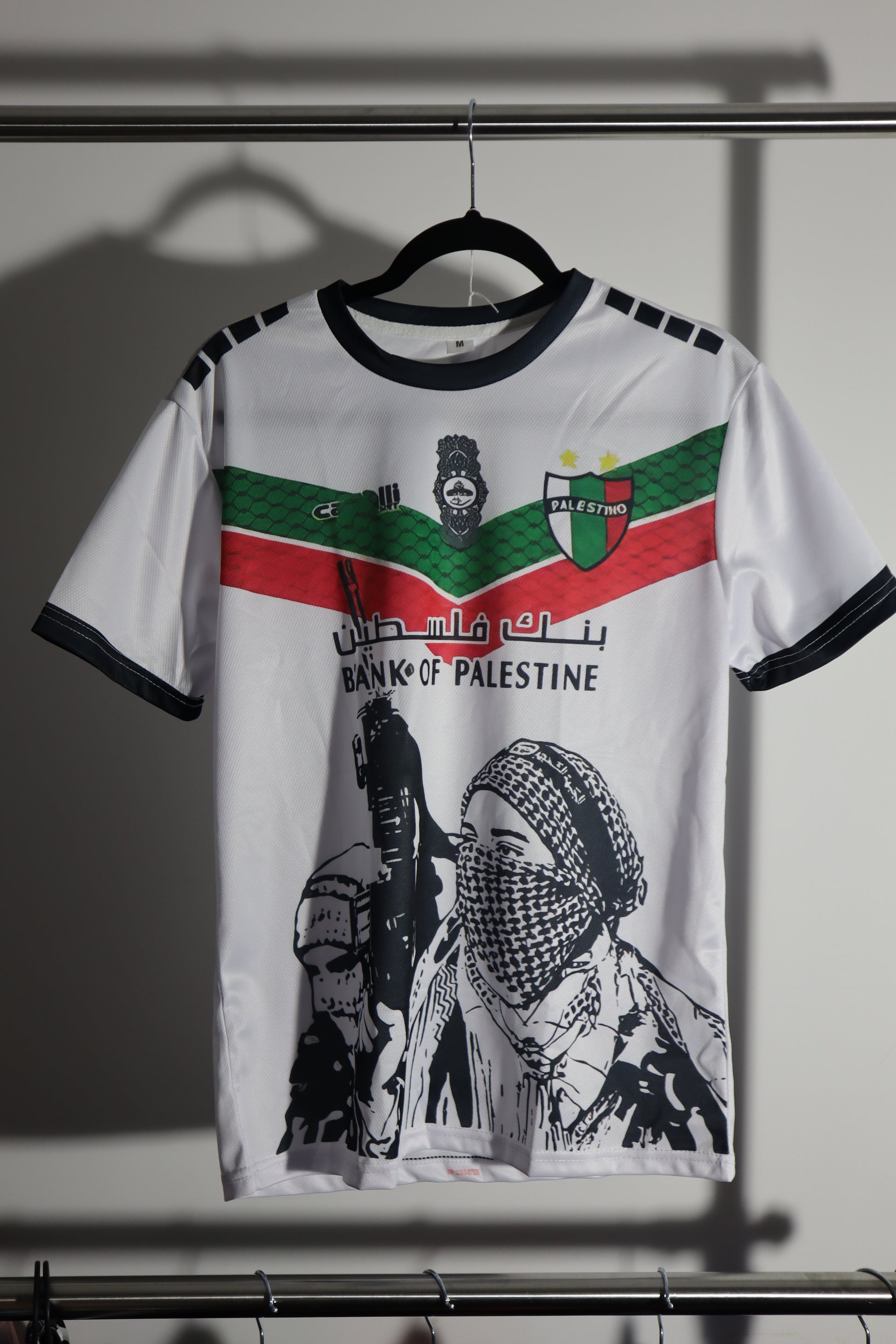 A powerful statement shirt featuring bold graphics of a masked figure with traditional keffiyeh pattern, celebrating Palestinian culture and resistance. The monochrome illustration against white with green and red chevron accents creates a striking visual that makes this one of football's most politically charged and artistically compelling jerseys.