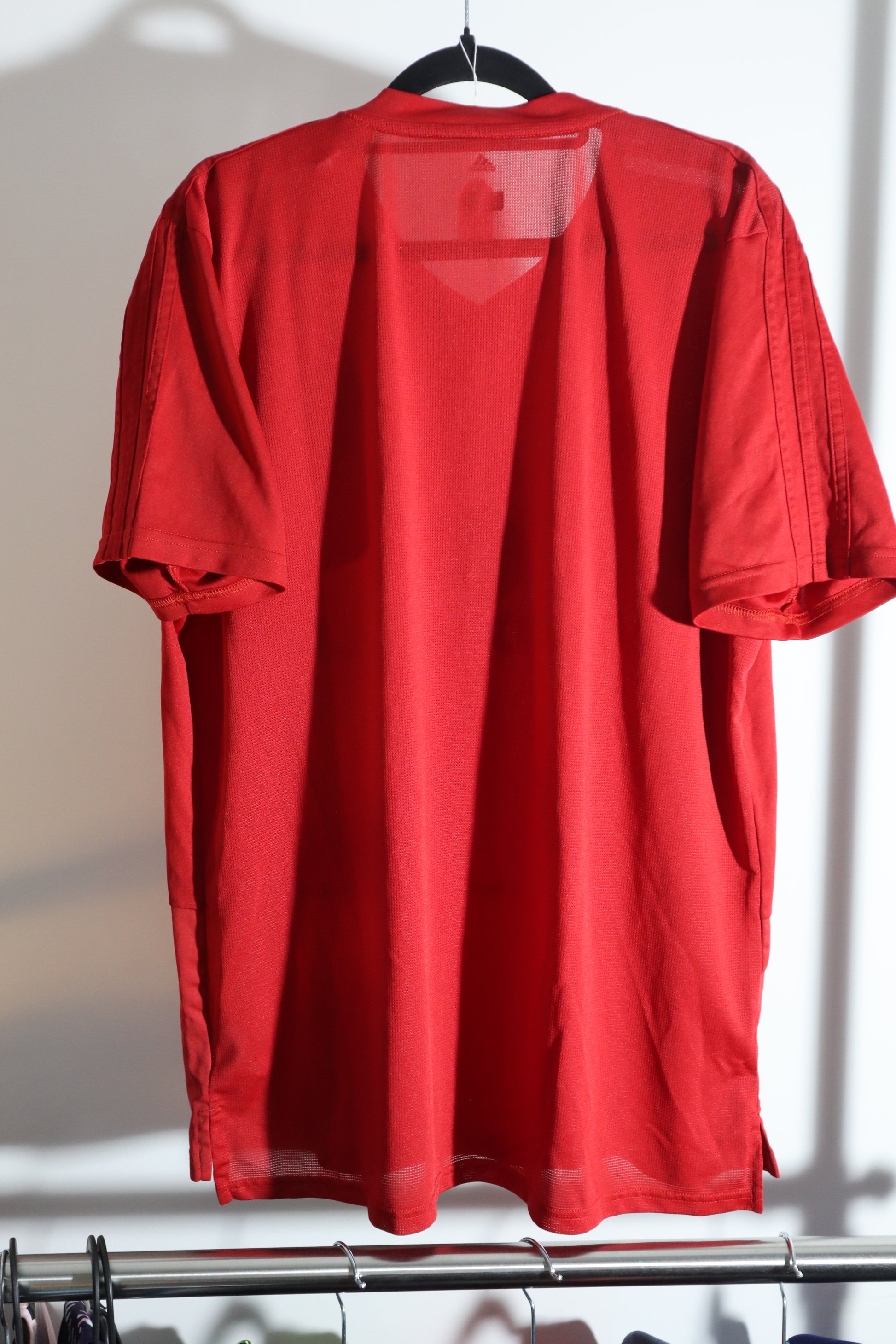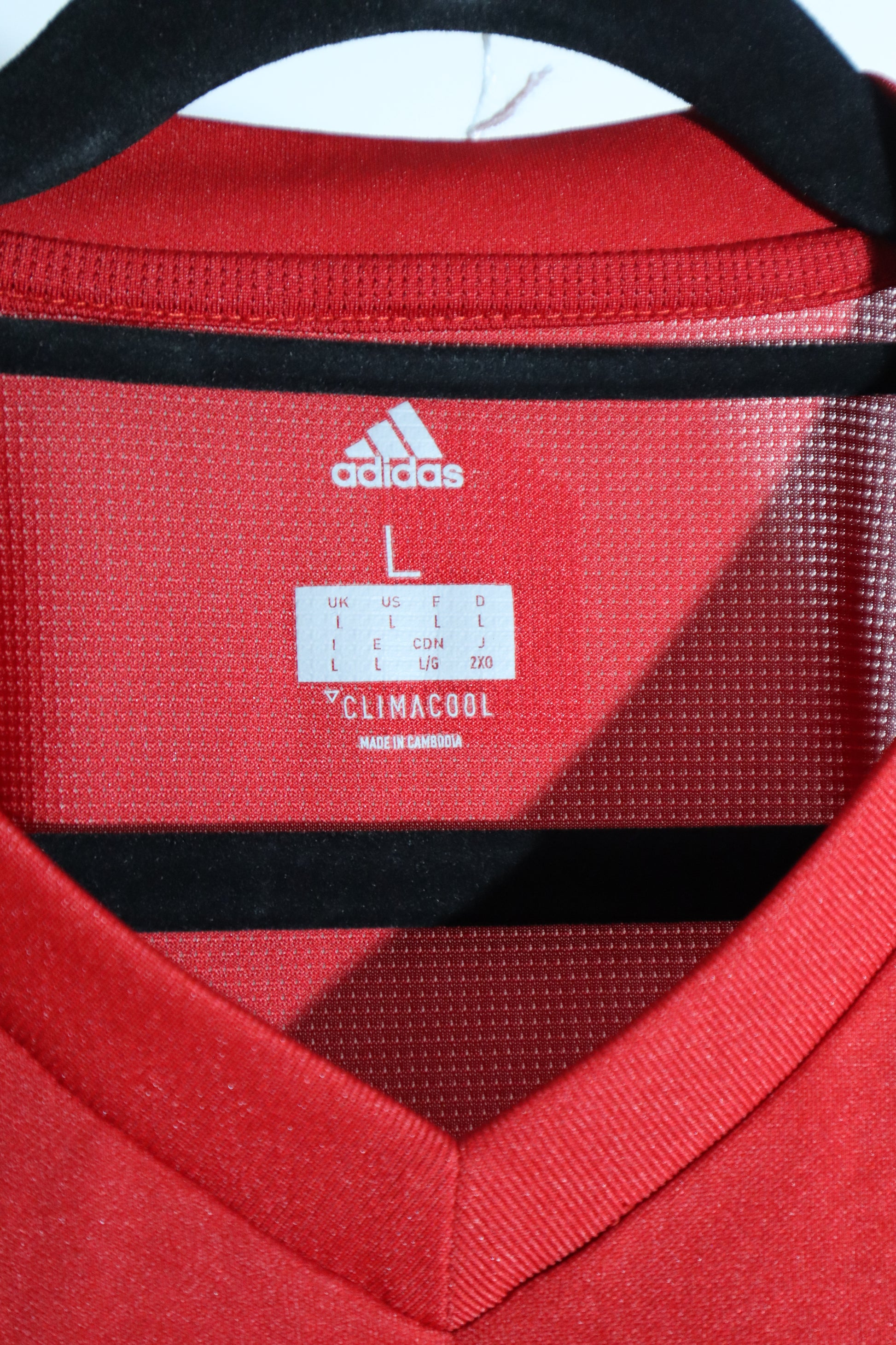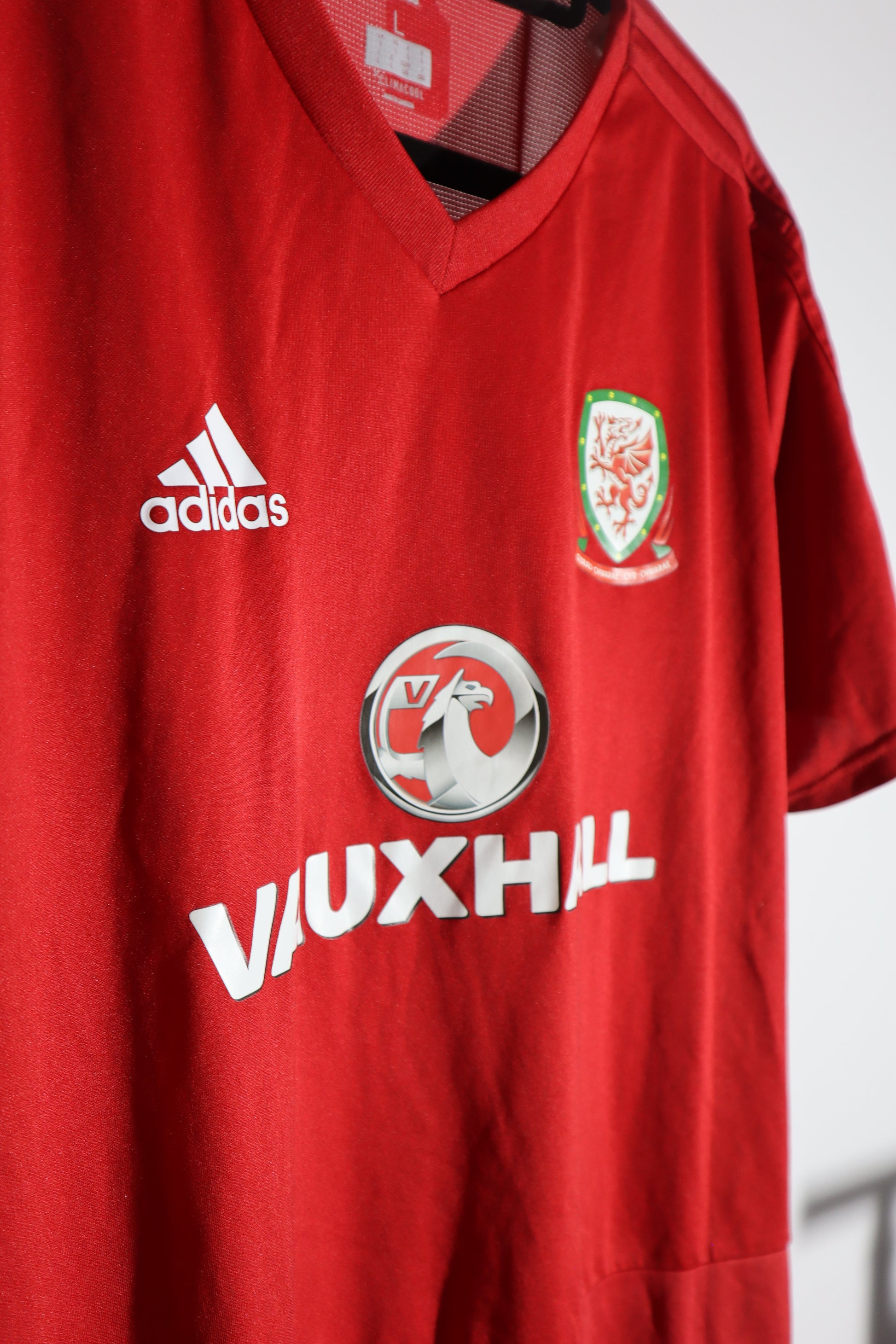 A classic red Adidas training shirt with the Welsh dragon crest and Vauxhall sponsorship displayed prominently. The understated design with white collar detailing represents the national team during an era of competitive qualification campaigns, carrying deep patriotic significance for Welsh supporters.