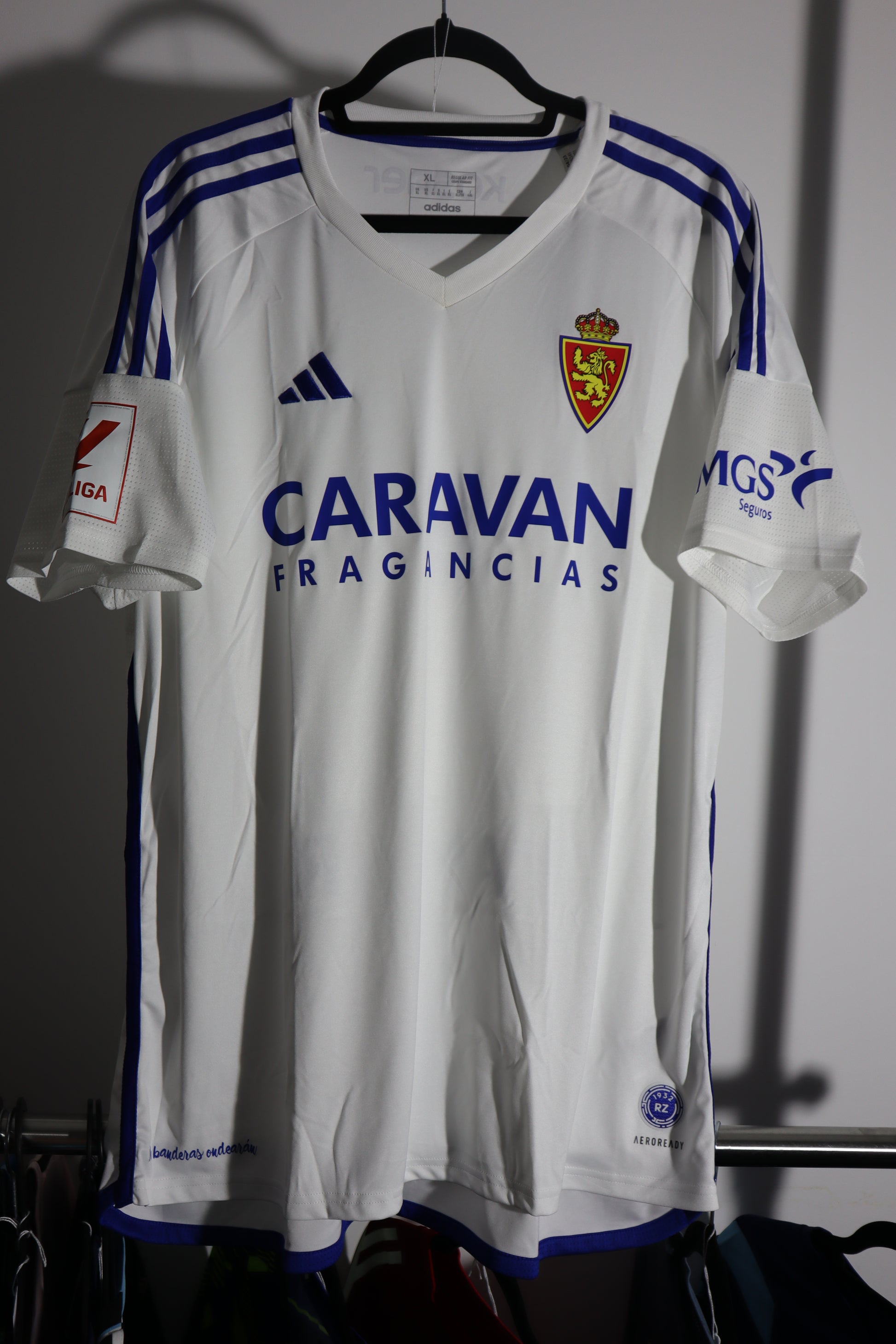 A clean white Adidas away shirt with navy blue shoulders and trim, featuring the Caravan Fragancias sponsorship and MGS logo. The minimalist, professional design with subtle geometric accents on the shoulders provides a sharp contrast to their home kit, representing Zaragoza's traditional away identity.